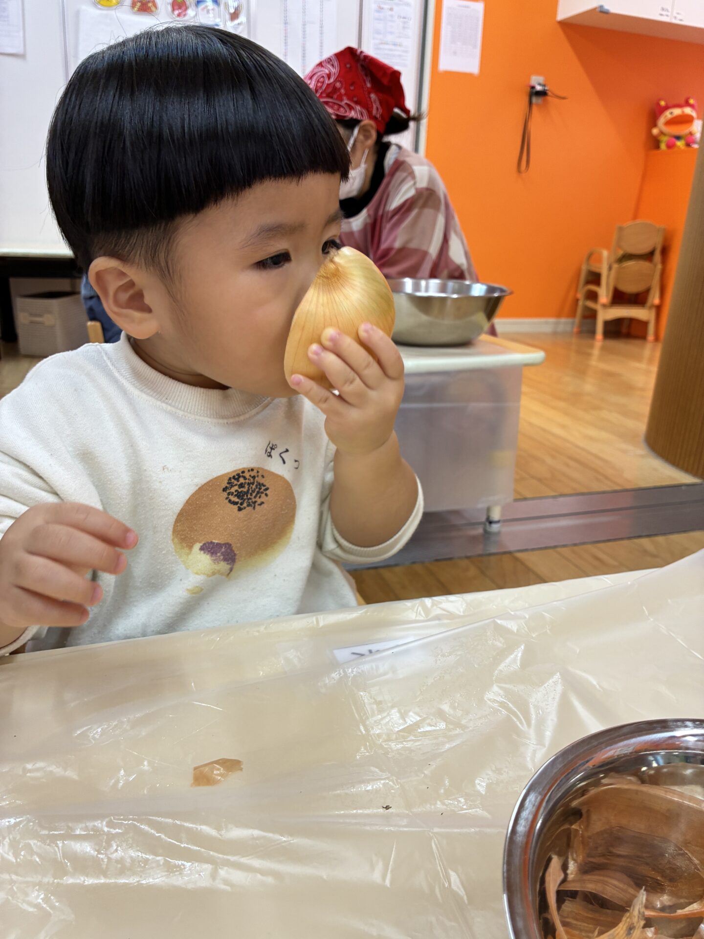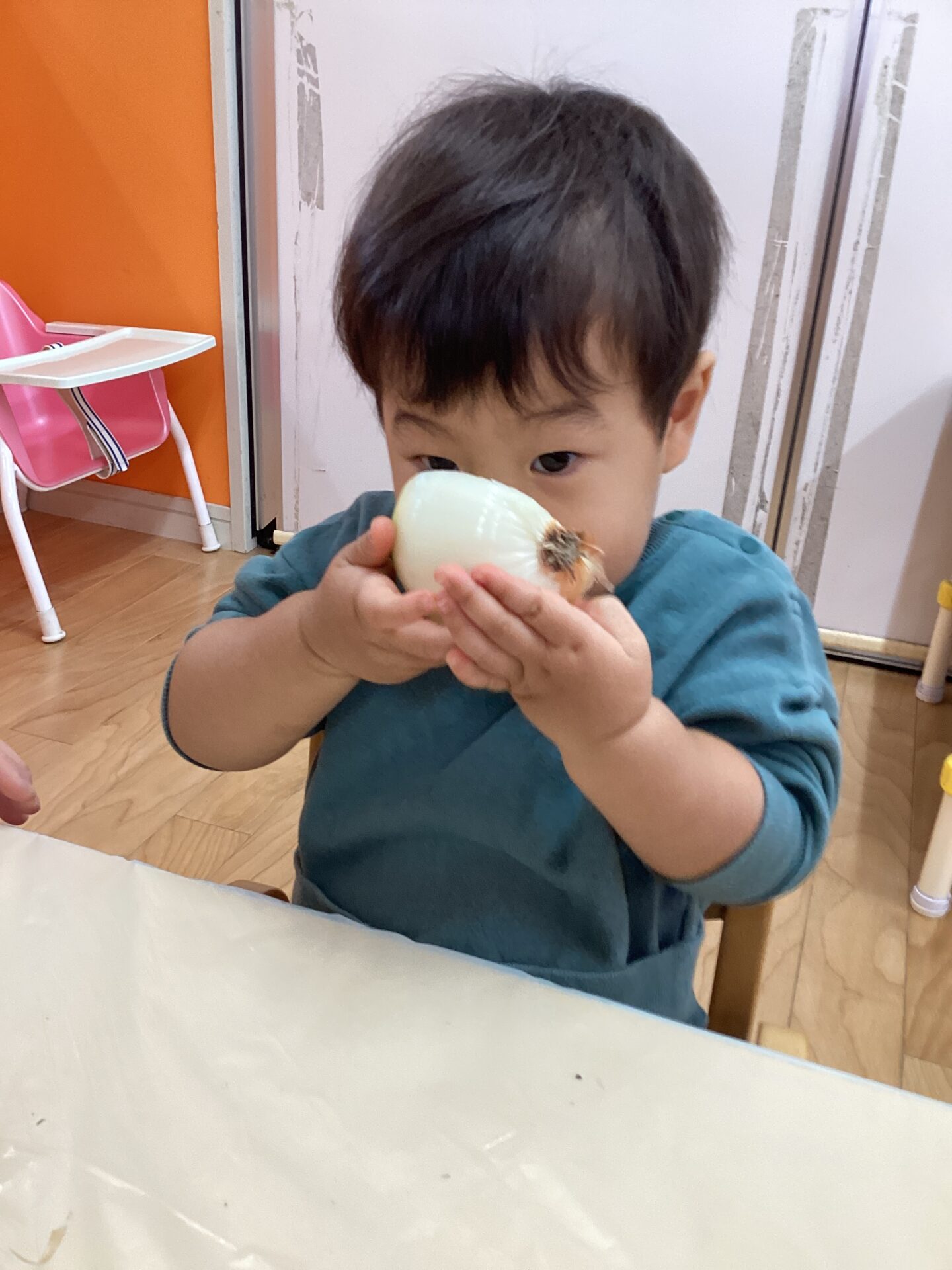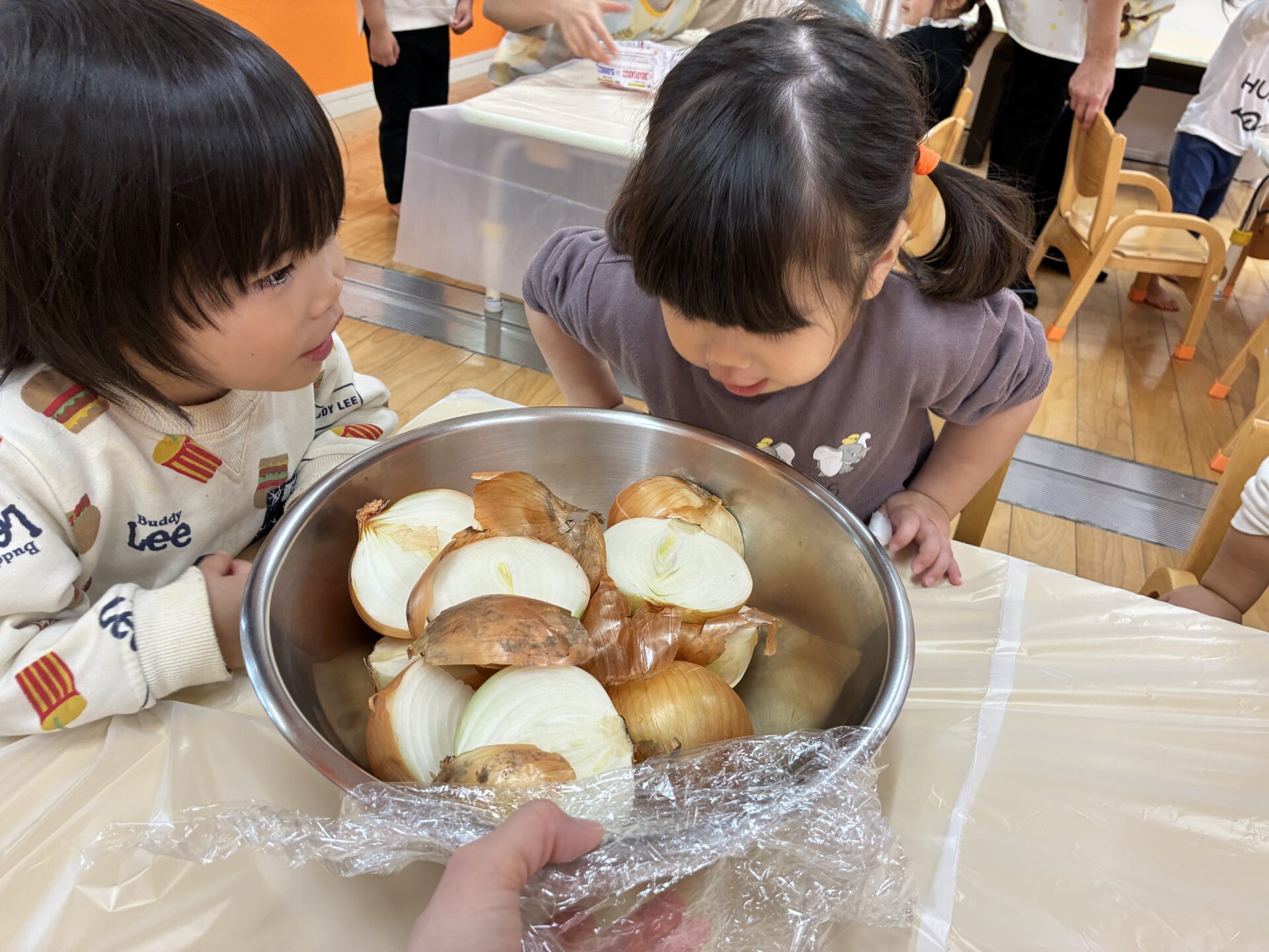 玉ねぎを近くで見て嬉しそうにしたり、鼻に近づけて匂いを嗅いだりする子もいました。