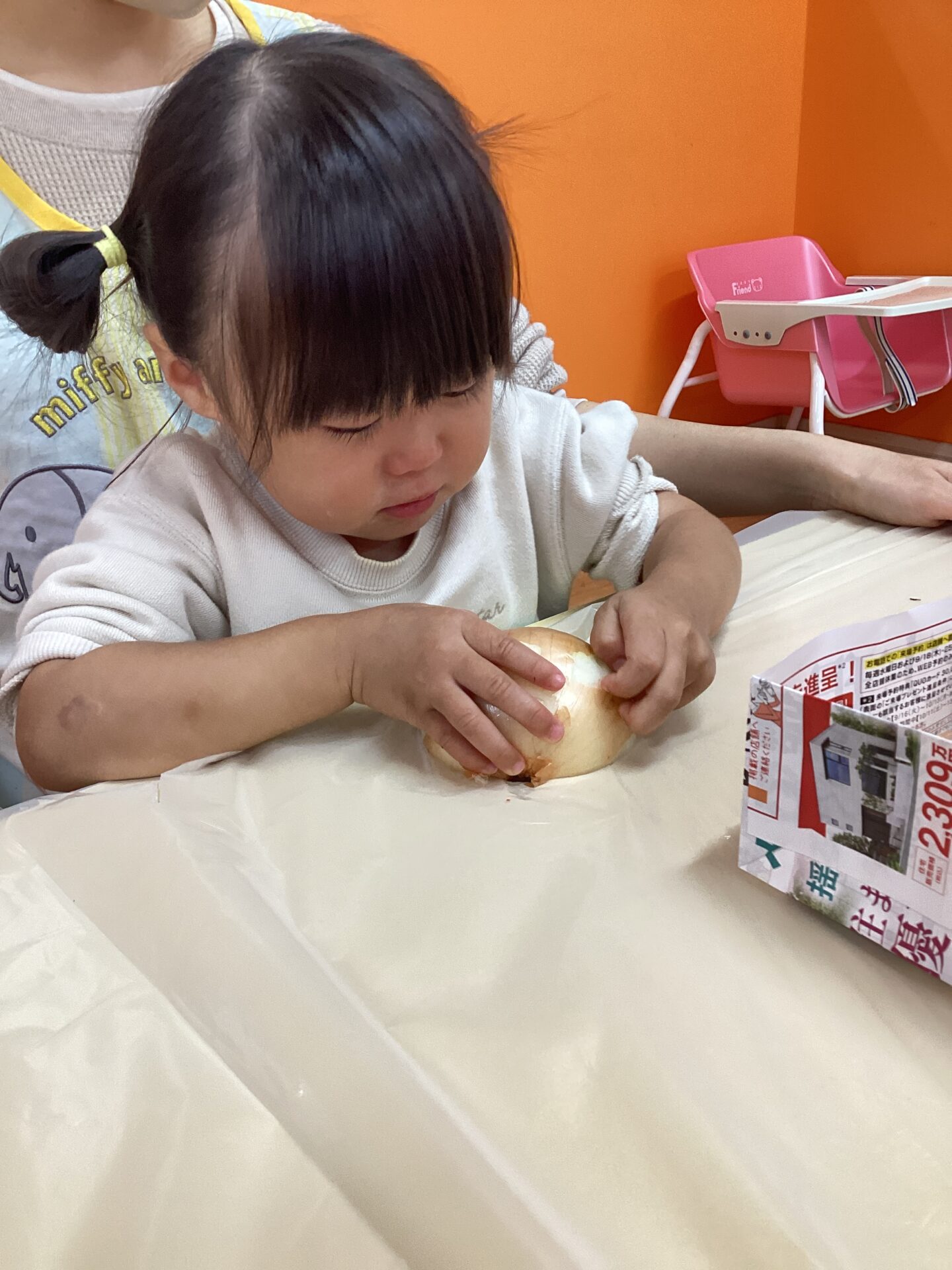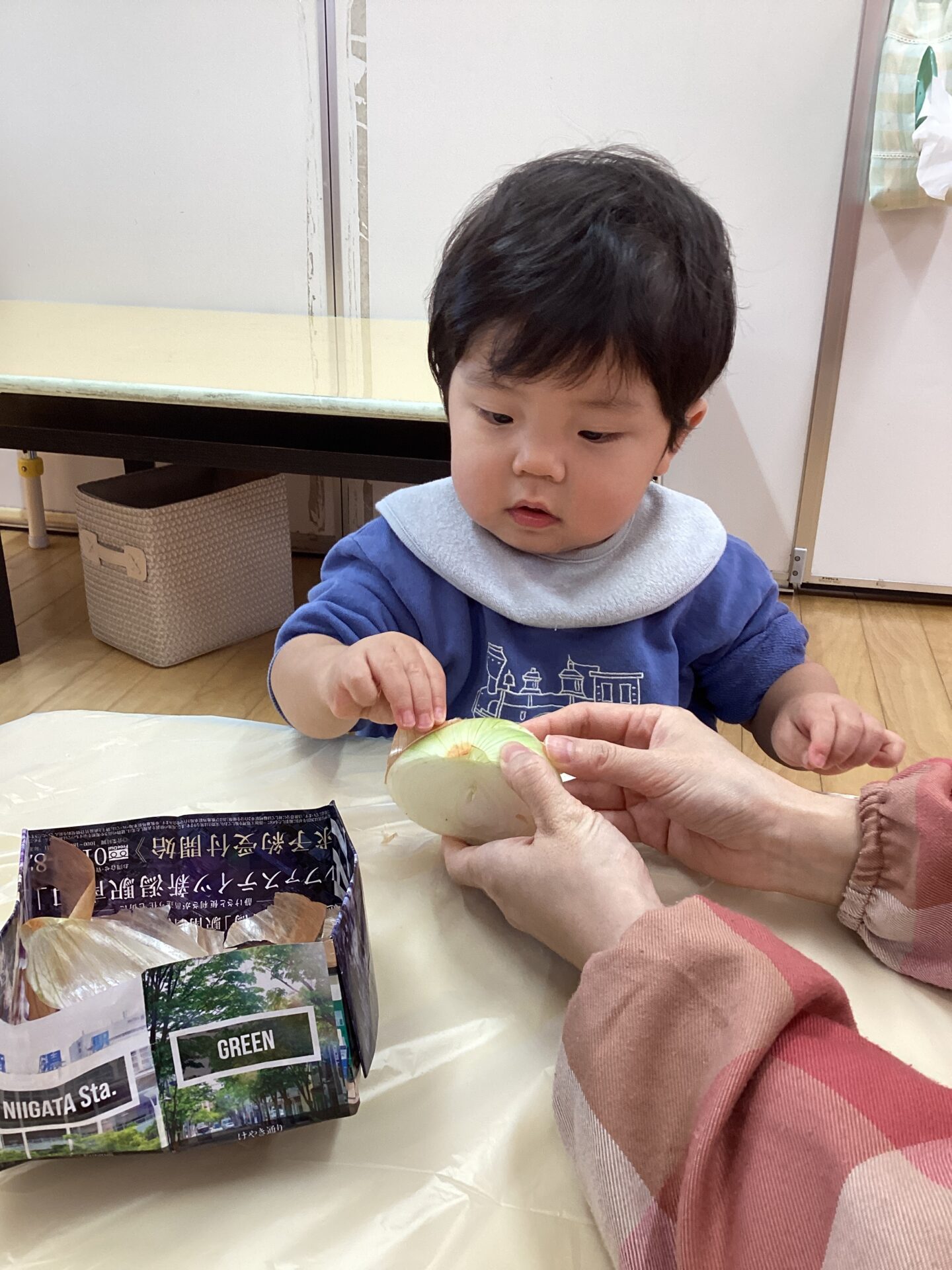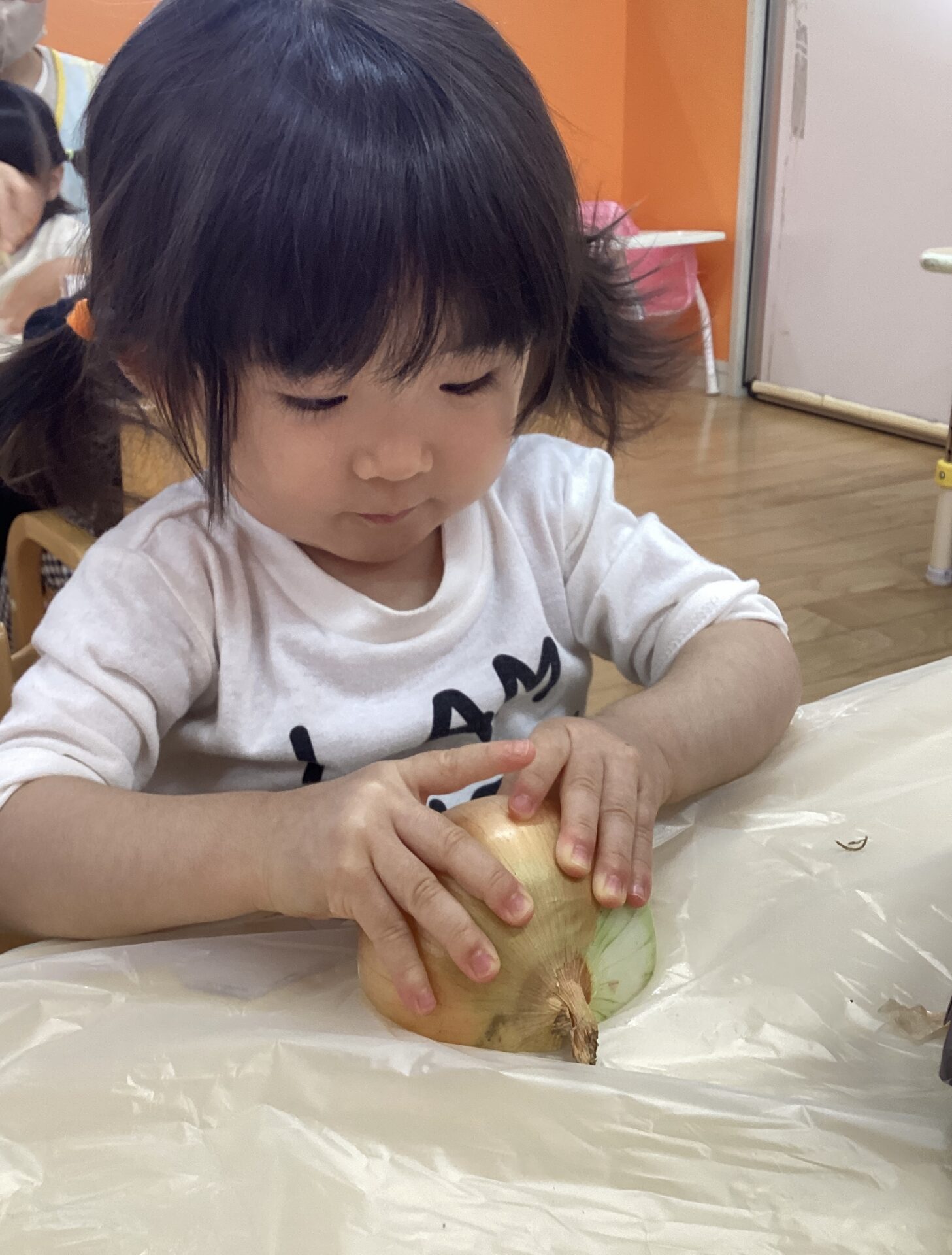玉ねぎを近くで見て嬉しそうにしたり、鼻に近づけて匂いを嗅いだりする子もいました。