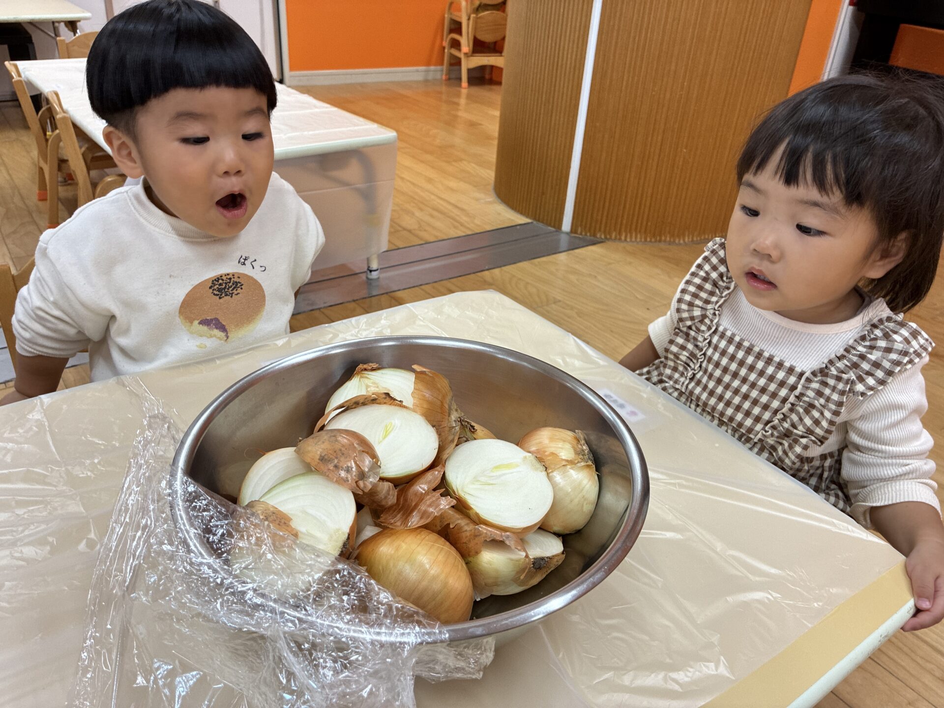 たくさんの玉ねぎを前に興味津々な子ども達👀✨