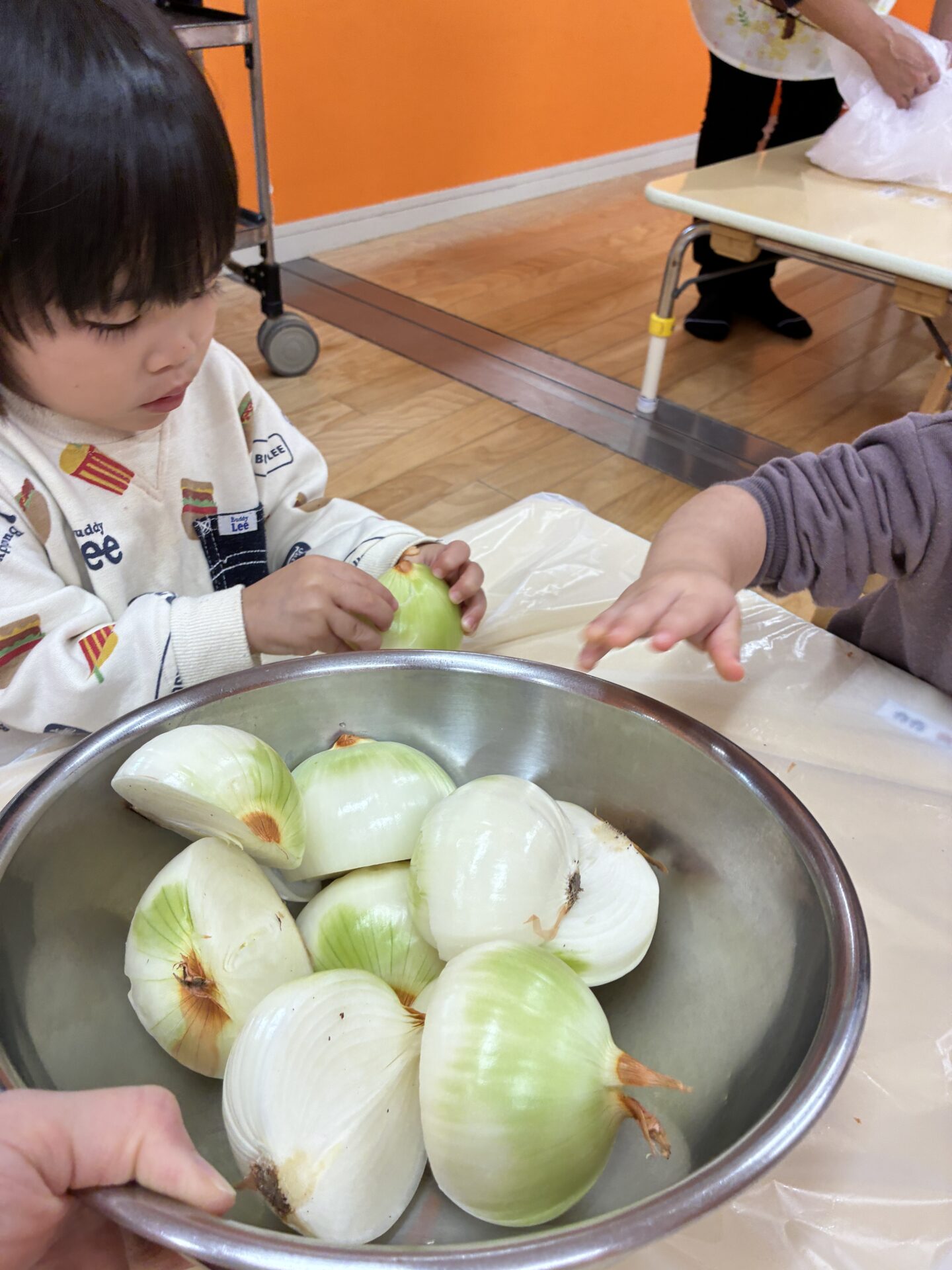 子ども達に「玉ねぎの皮むきのお手伝いするよ~!」と伝えると、以前の経験を思い出し、始まる前から早くやりたい!と意気込む姿が見られました😊🌟