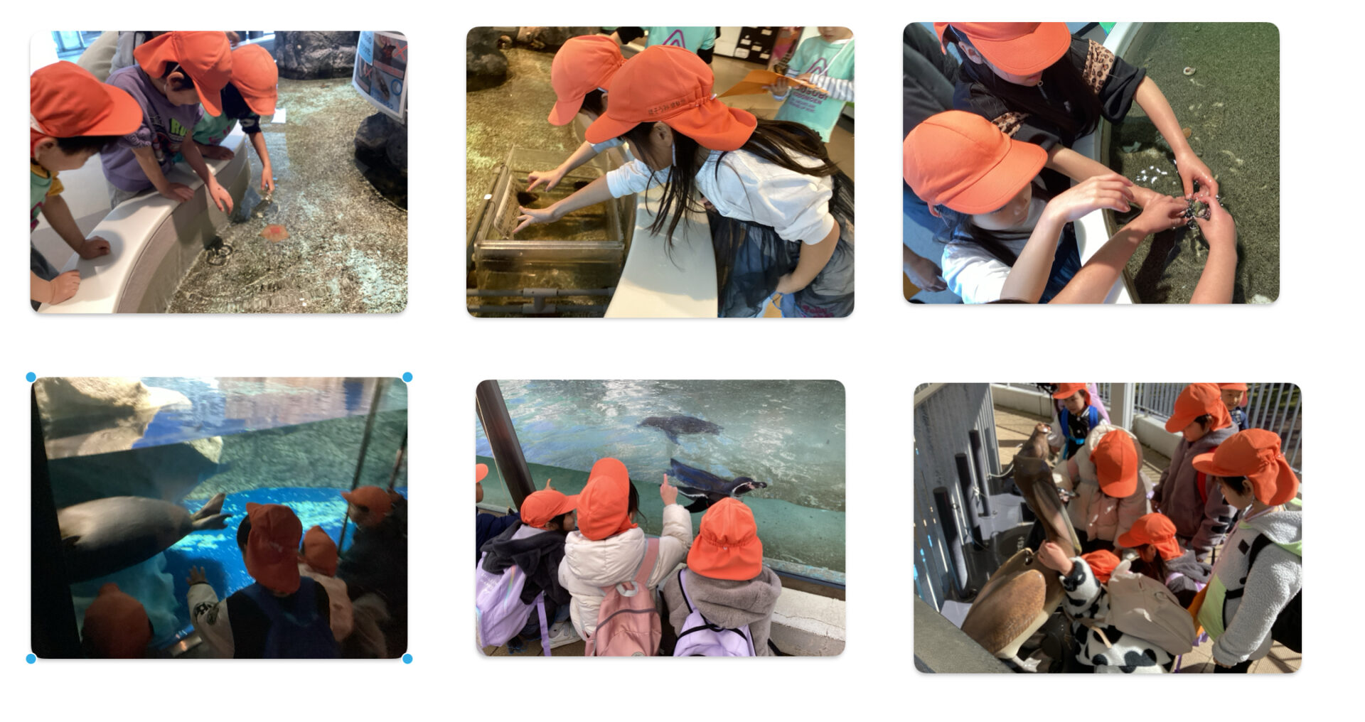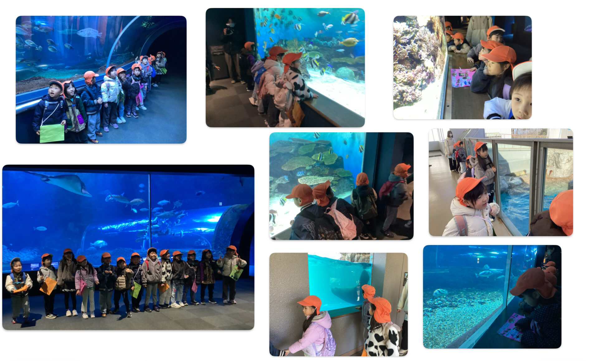 いろいろな魚や生き物がいる水槽を興味津々で見つめる子ども達。そして、自分で作った図鑑を開きながら「この魚と同じだぁ〜!」と大喜びしたり「僕の図鑑にあるのはいない…」と少し残念そうなお友だちもいましたが、大きな水槽やトンネルの所に来ると「わぁ〜、すご〜い!」と目をまん丸にして見上げていました。