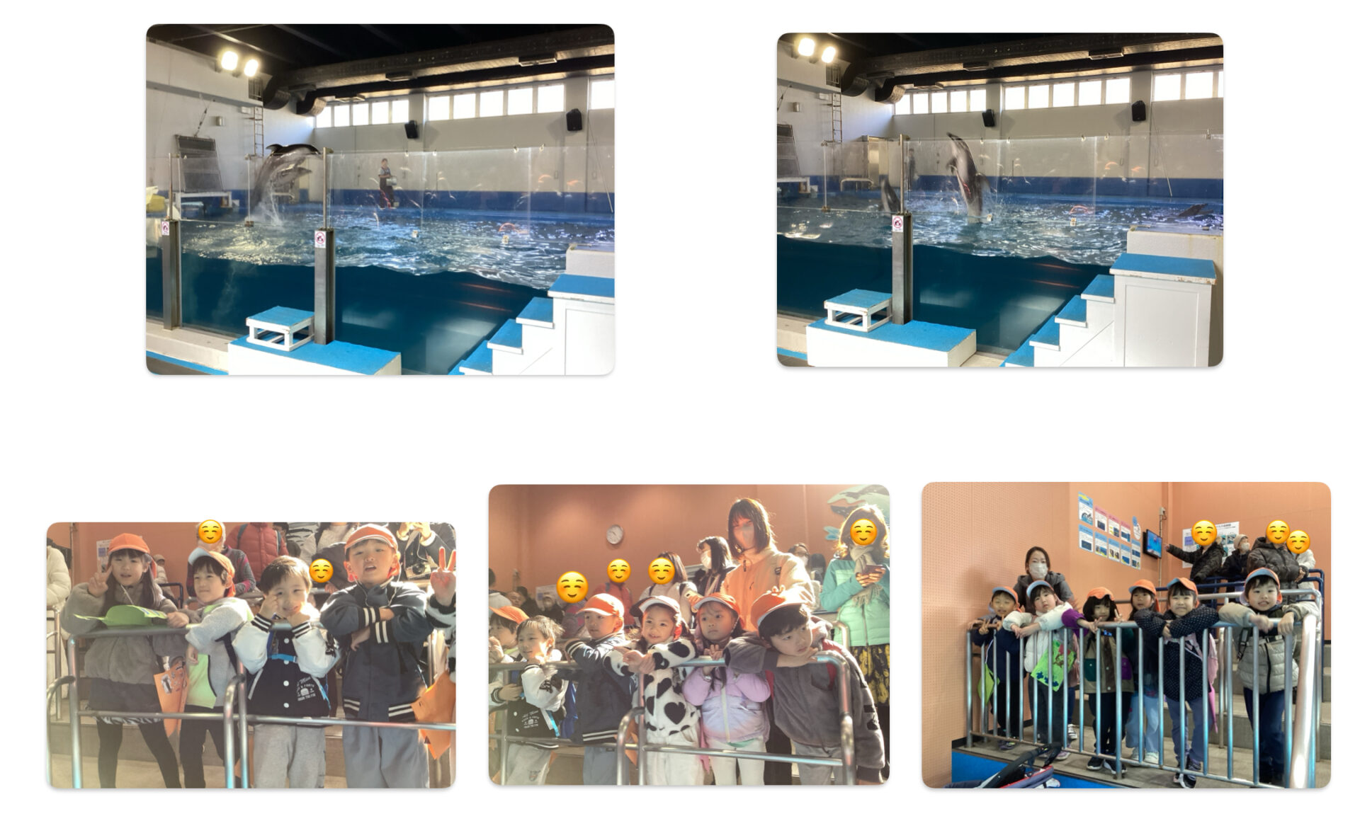 イルカショーが始まる前「イルカって頭に息をするところがあるんだよ」や「イルカってかしこいんだよ」とイルカの生態について、いろいろ教えてくれたお友だちがいました。その話を聞いていた保育者が「すごいね、イルカ博士だね」と言うと、周りにいたお友だちも「そうだね!」と盛り上がり、みんなで楽しくおしゃべりしながら待っていました!