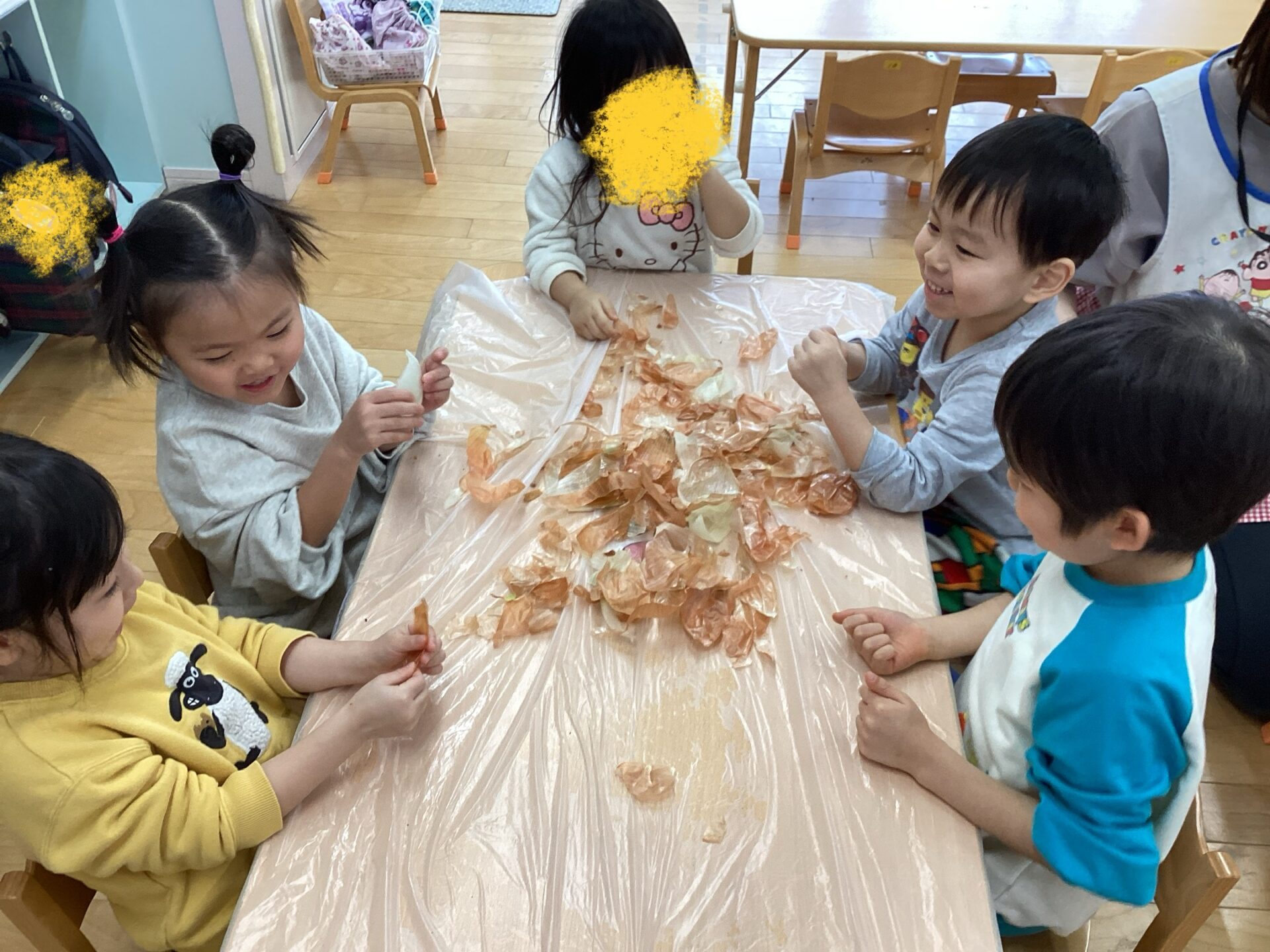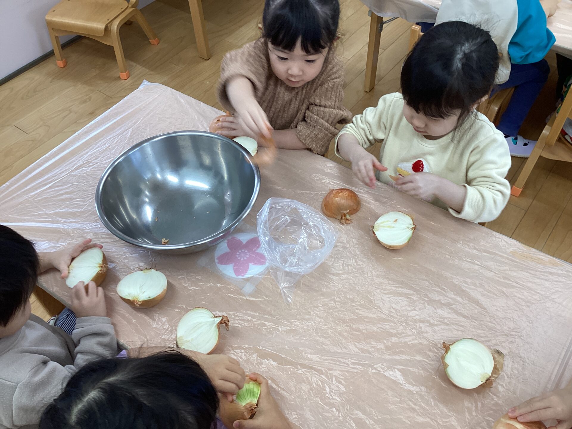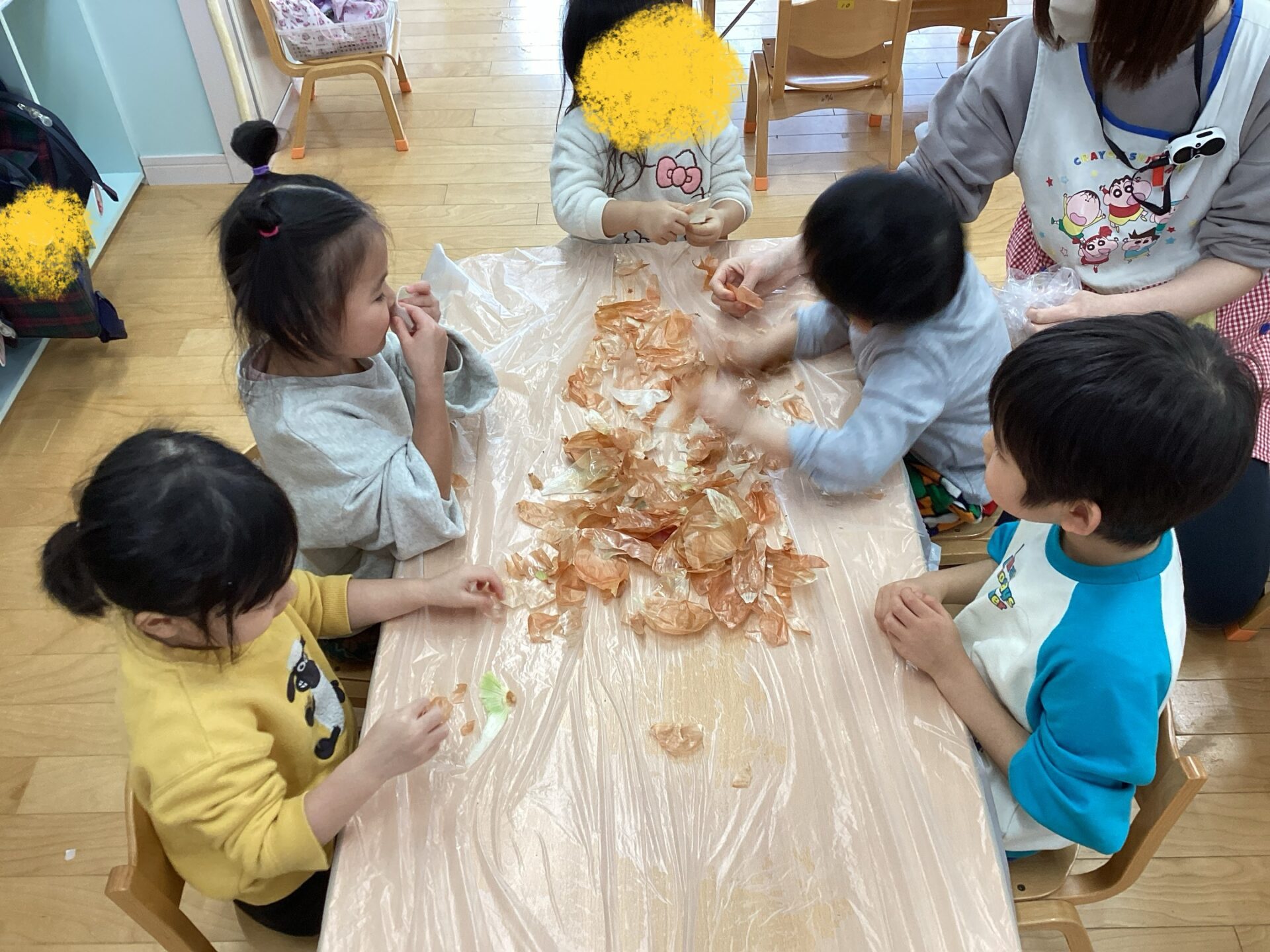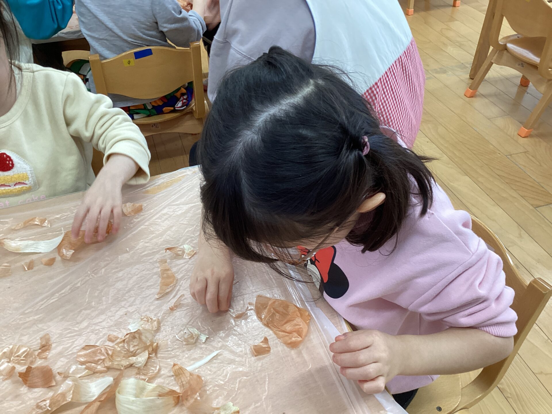 玉ねぎの皮むきに挑戦‼️(3歳児 ゆきぐみ)
