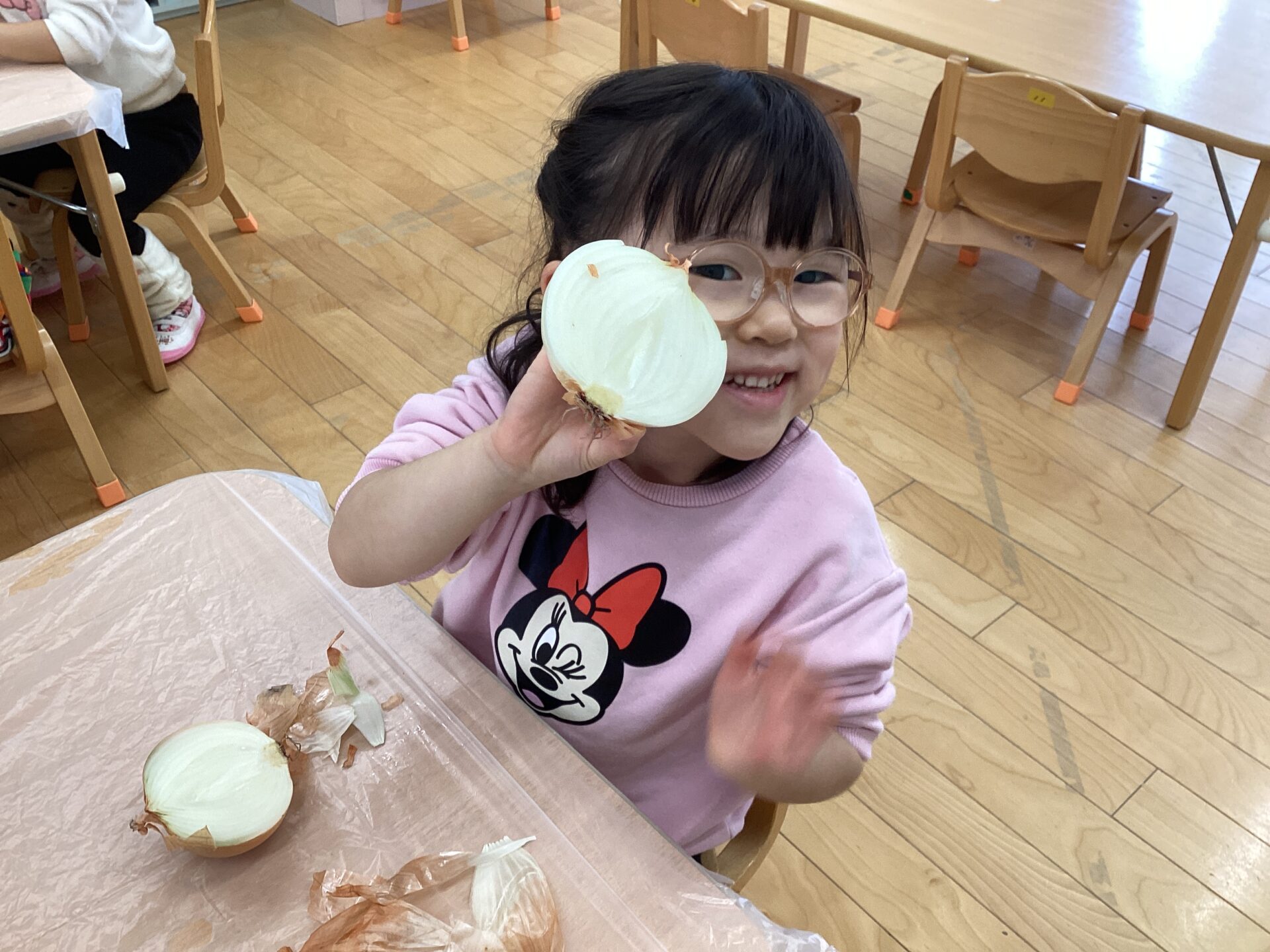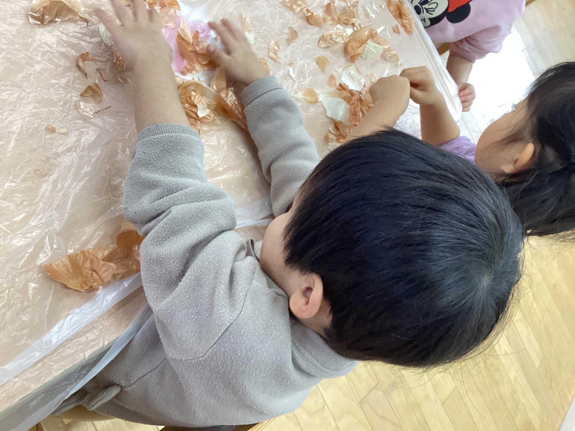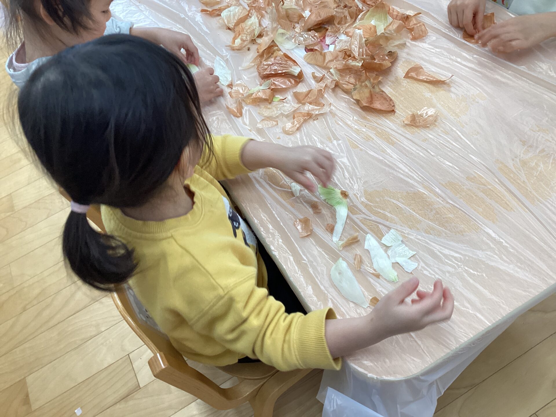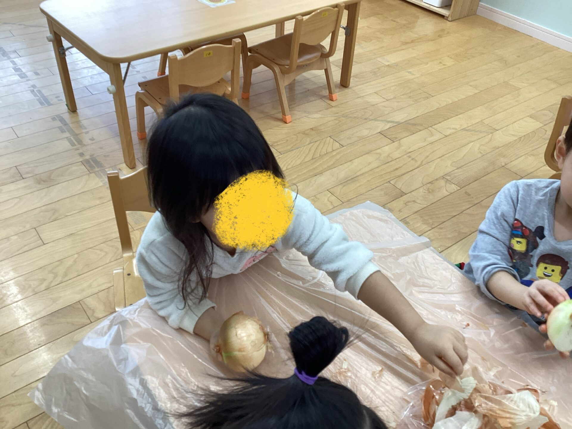 玉ねぎの皮むきに挑戦‼️(3歳児 ゆきぐみ)