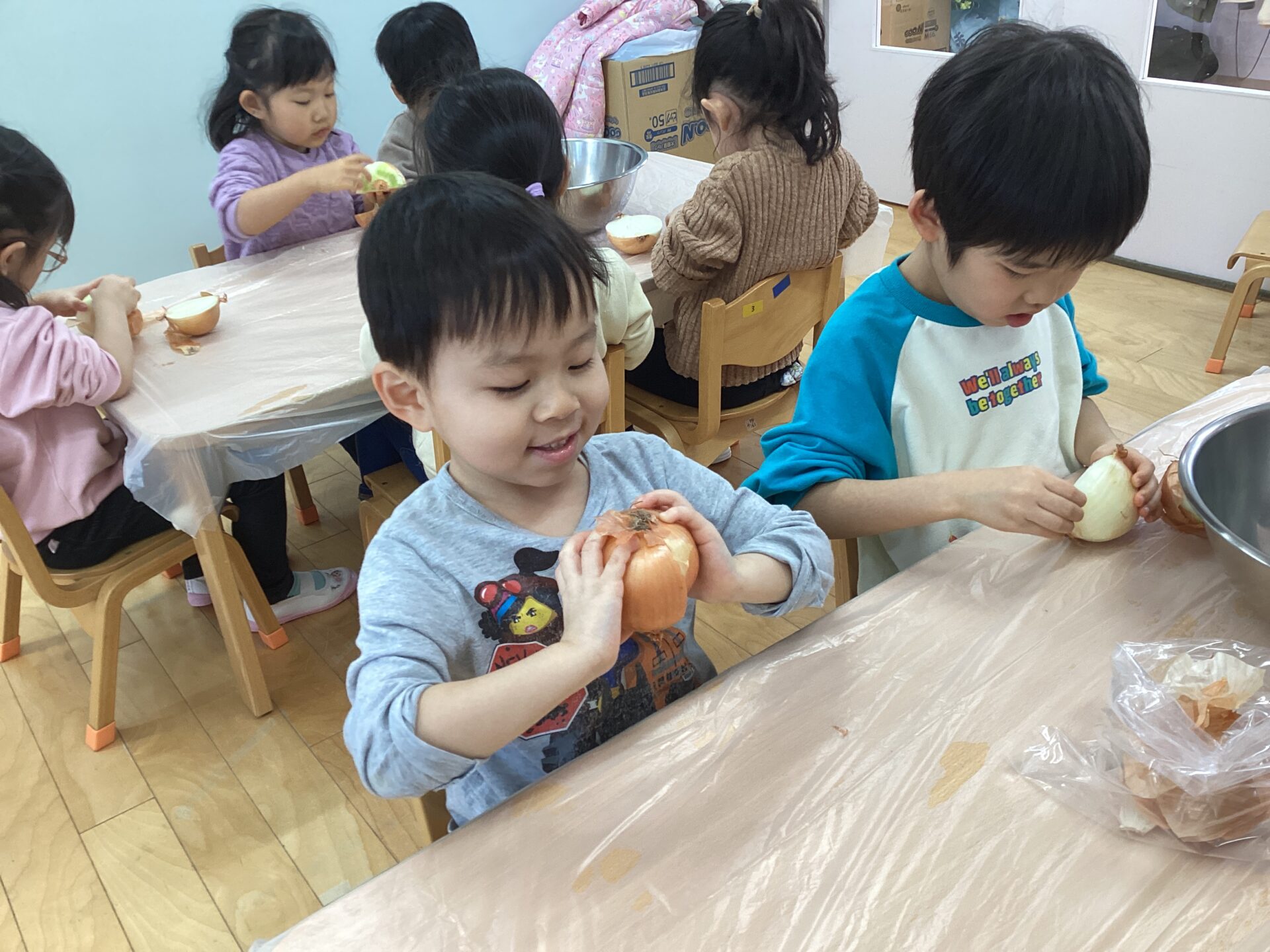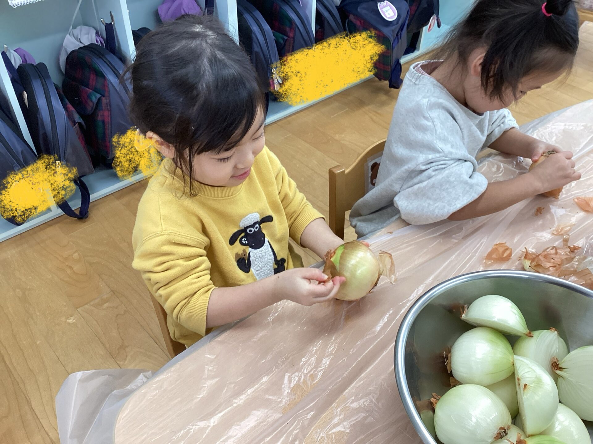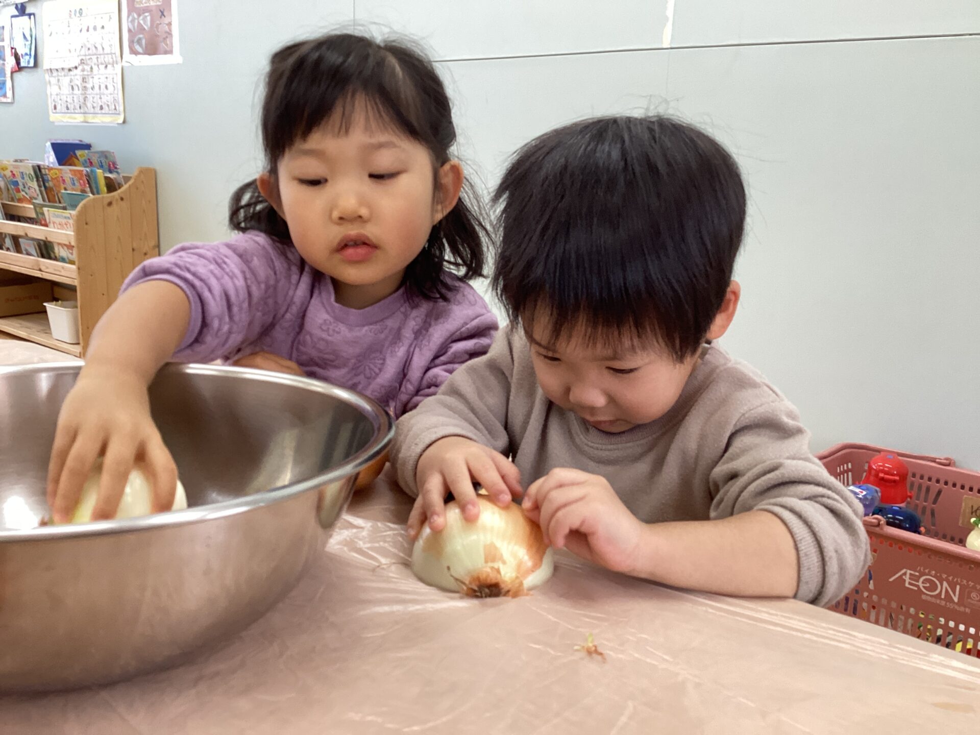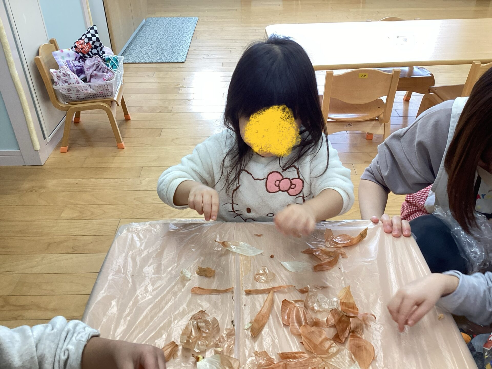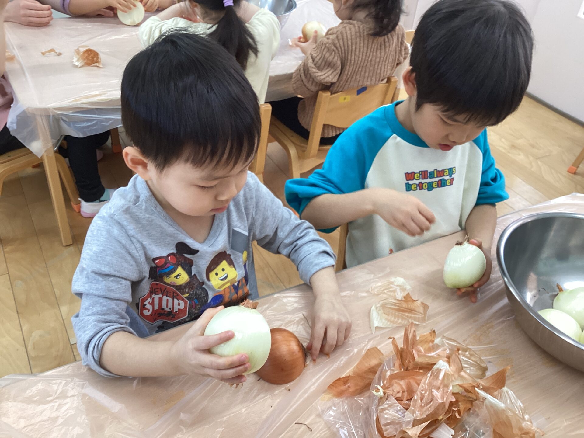 玉ねぎの皮むきに挑戦‼️(3歳児 ゆきぐみ)