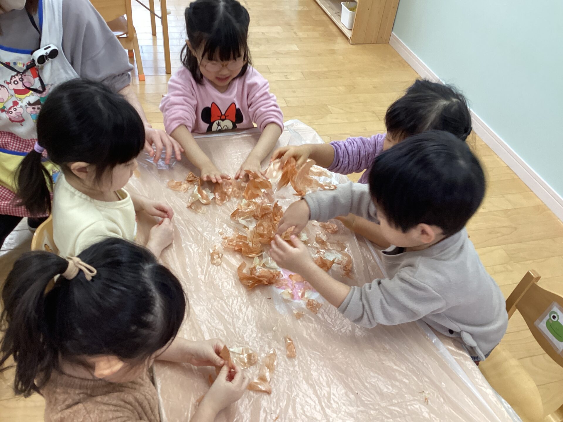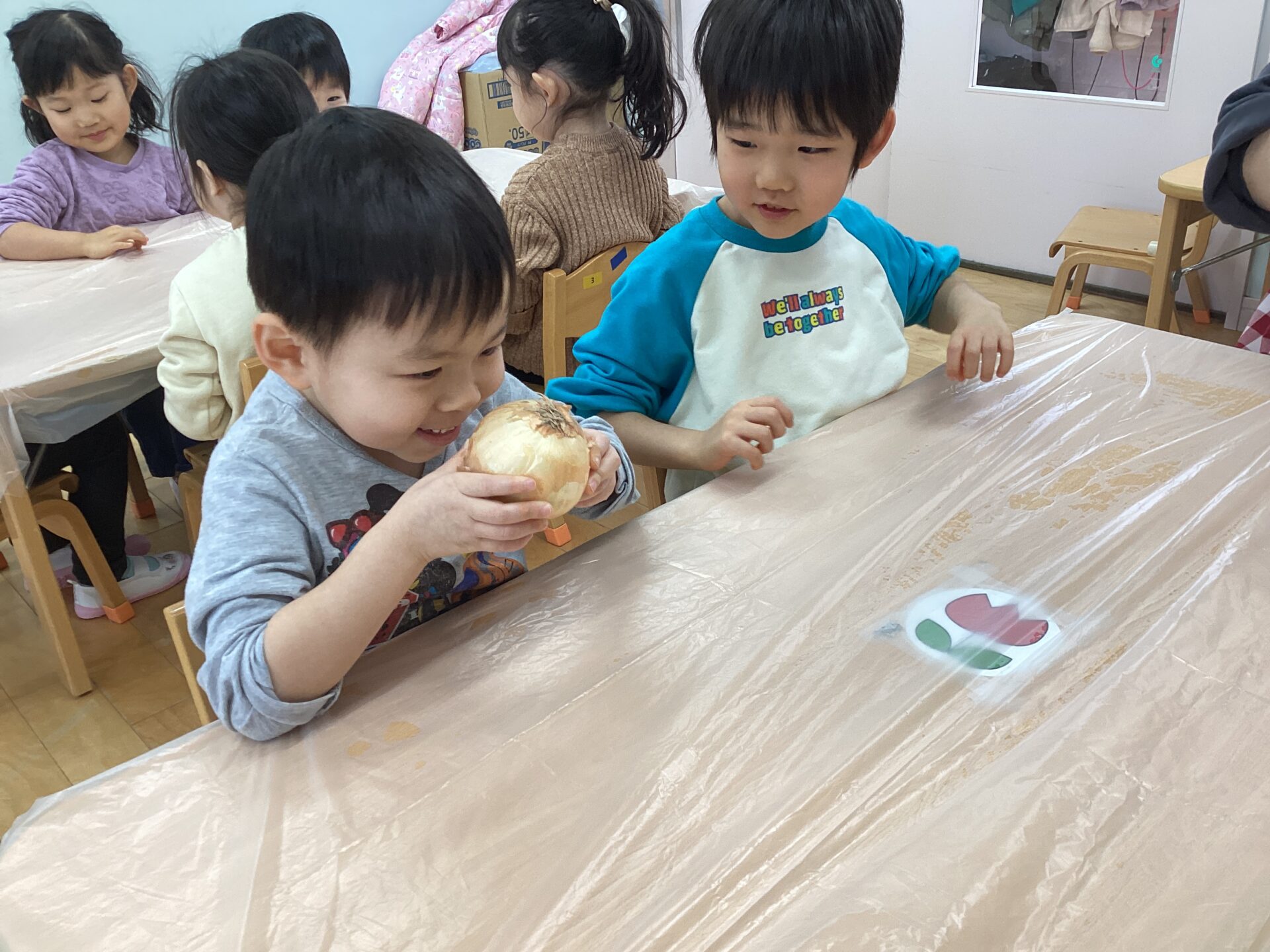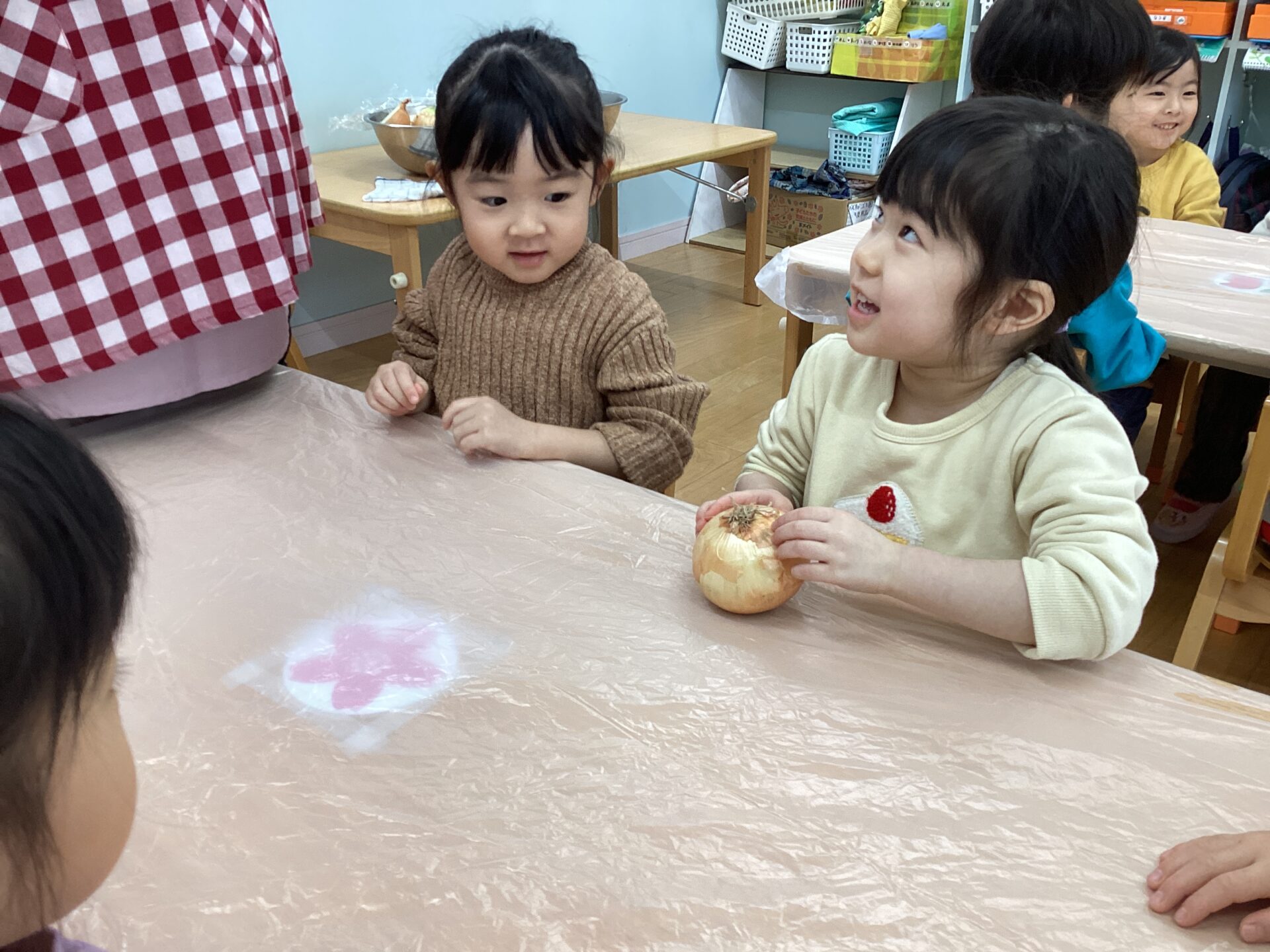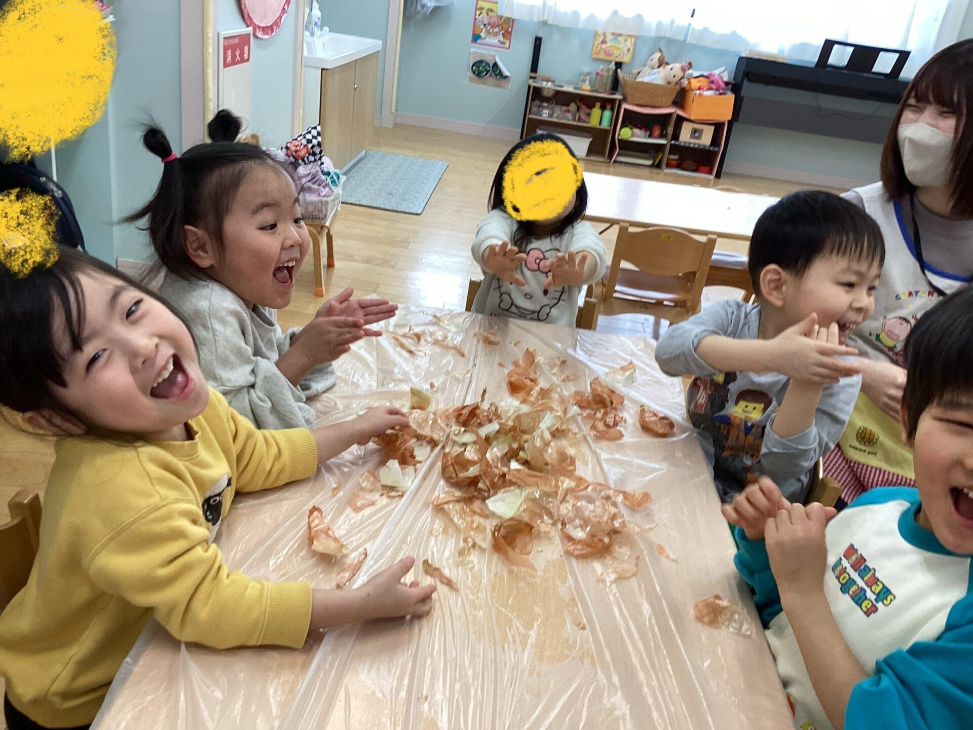 玉ねぎの皮むきに挑戦‼️(3歳児 ゆきぐみ)