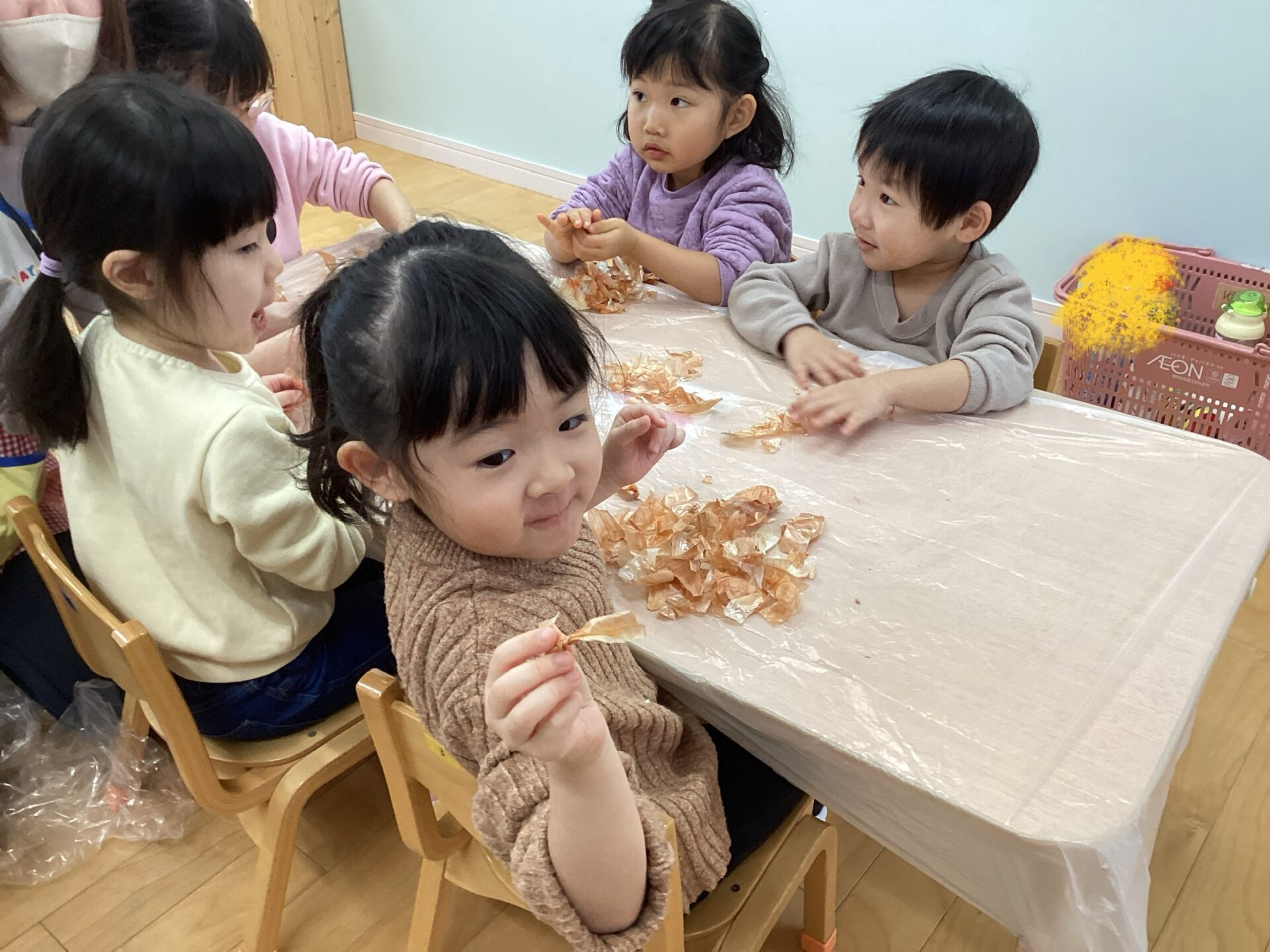 真剣に茶色い皮をむいてくれている子どもたち😊「楽しいね〜」とウキウキでした♪